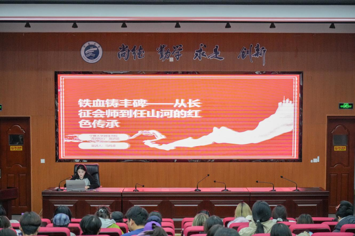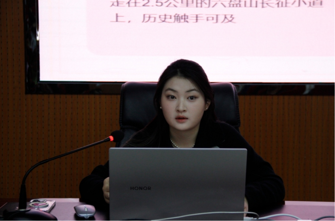 马鸣卓带领学员回顾红军长征在宁夏胜利会师的历史,重温习近平总书记“长征永远在路上”的嘱托。她系统梳理了长征历程,结合任山河战斗中燕飞烈士英勇牺牲的事迹,深刻阐释了“一不怕苦、二不怕死”的革命精神内涵。她通过分享将台堡研学经历和固原二中师生三十年坚持徒步扫墓的感人事迹,生动展现了红色基因的赓续传承,号召大家将长征精神融入日常学习生活,走好新时代长征路。