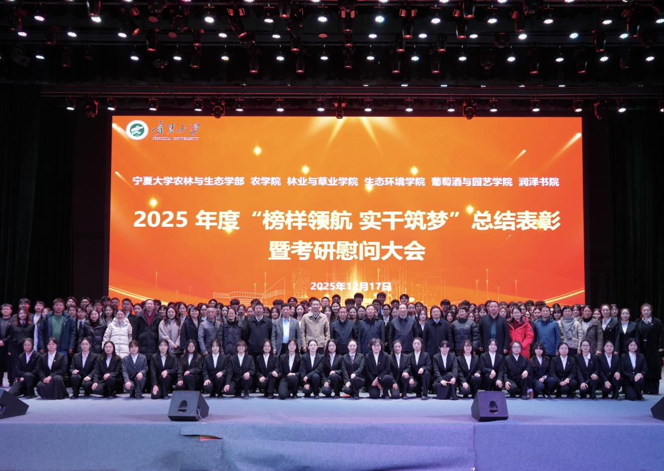 12月17日,宁夏大学农林与生态学部、农学院、林业与草业学院、葡萄酒与园艺学院、生态环境学院、润泽书院在大学生活动中心举办2025年度“榜样领航 实干筑梦”总结表彰暨考研慰问大会。学校党委常委、纪委书记、监察专员马元出席大会。学部、学院、书院领导班子和全体辅导员、全体本科生及研究生参加。大会由润泽书院副院长陈楠主持。