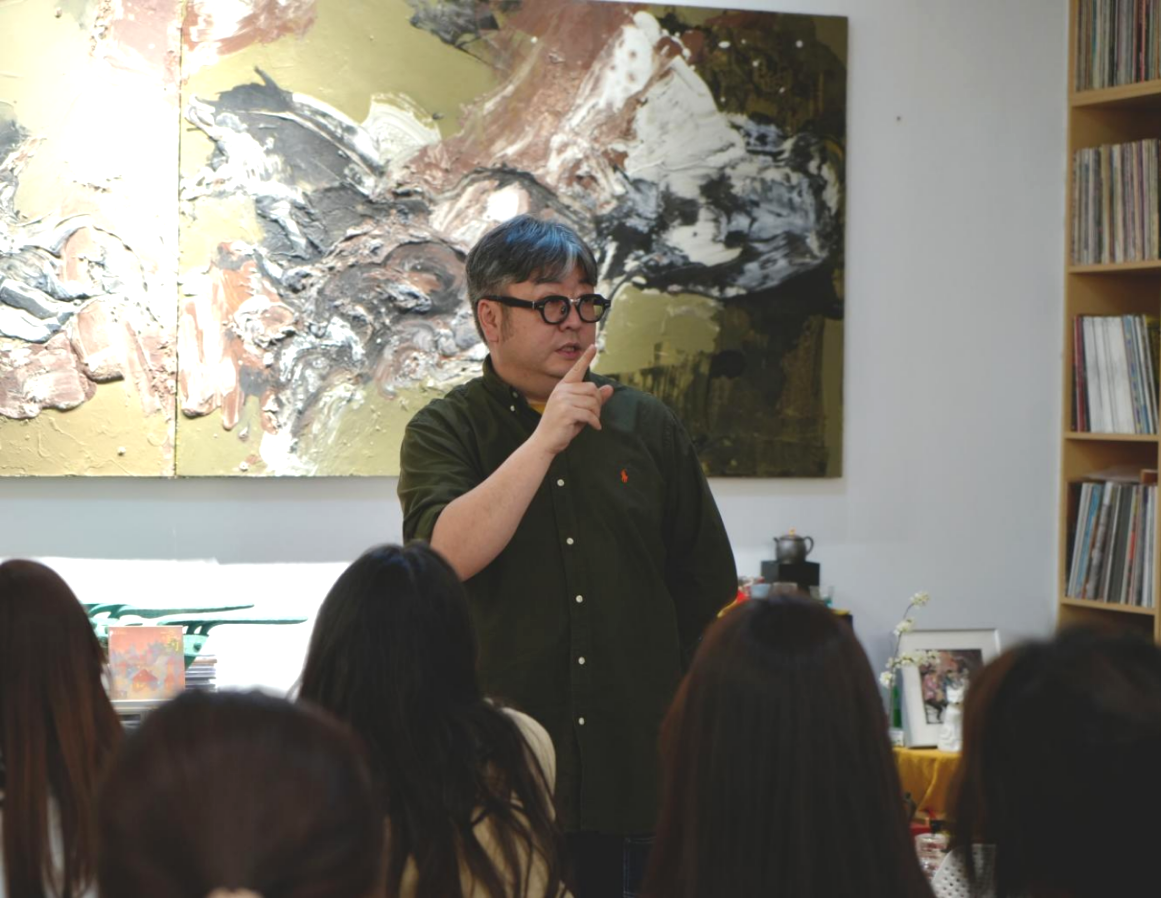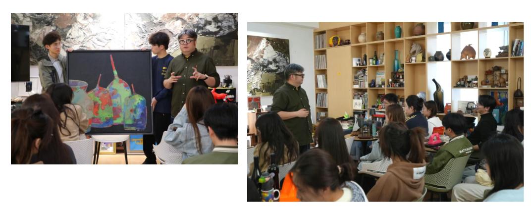 活动伊始,马浩谦以三幅画作作为切入点,引导同学们在音乐的伴奏下选择自己心仪的作品,并交流各自的感受。有人从画中看到春天的活力,有人读到夏日森林的光影,也有人被色彩之间的交织所打动。在互动中,马浩谦结合自身美育经历,总结了“记录”“分享”“自律”三个关键词:记录是用镜头和文字留存生活瞬间,让美好的记忆有迹可循;分享是传递情绪与正能量,感染身边人;自律则是建立边界感、做好自己,在日复一日的坚持中成就成长。