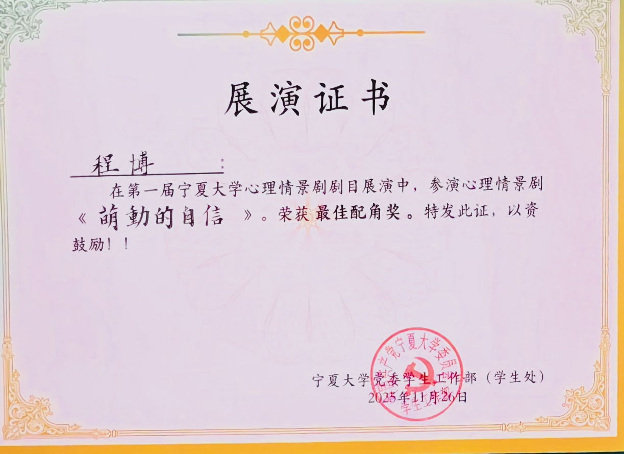 11月26日,第一届宁夏大学心理情景剧剧目展演圆满落幕。润泽书院学子精心打造的原创剧目《萌动的自信》凭借真挚的演绎与深刻的主题,从8部参赛作品中脱颖而出,荣获展演一等奖。同时,书院获评“最佳组织单位奖”,程博同学凭借细腻出彩的表演斩获“最佳配角奖”。